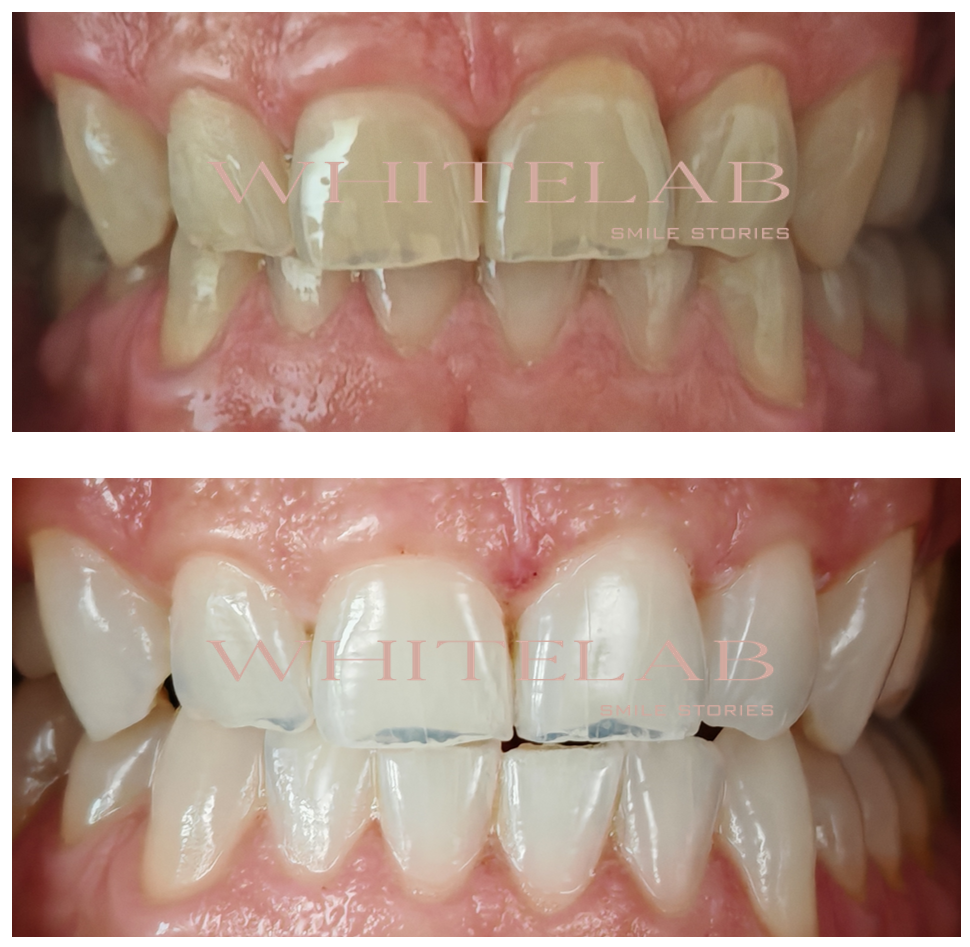 Per raggiungere questo risultato ho scelto un protocollo di sbiancamento professionale domiciliare, in quanto consente un controllo graduale e personalizzato del processo di schiarimento, offrendo i risultati più efficaci sia in termini di miglioramento cromatico sia di stabilità del colore nel tempo.